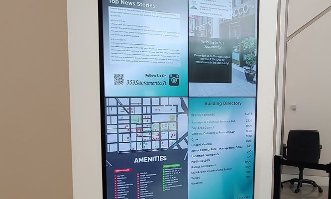 A video wall in a building is used to inform, guide, brand, monetize, and alert on-site audiences. Top applications include: