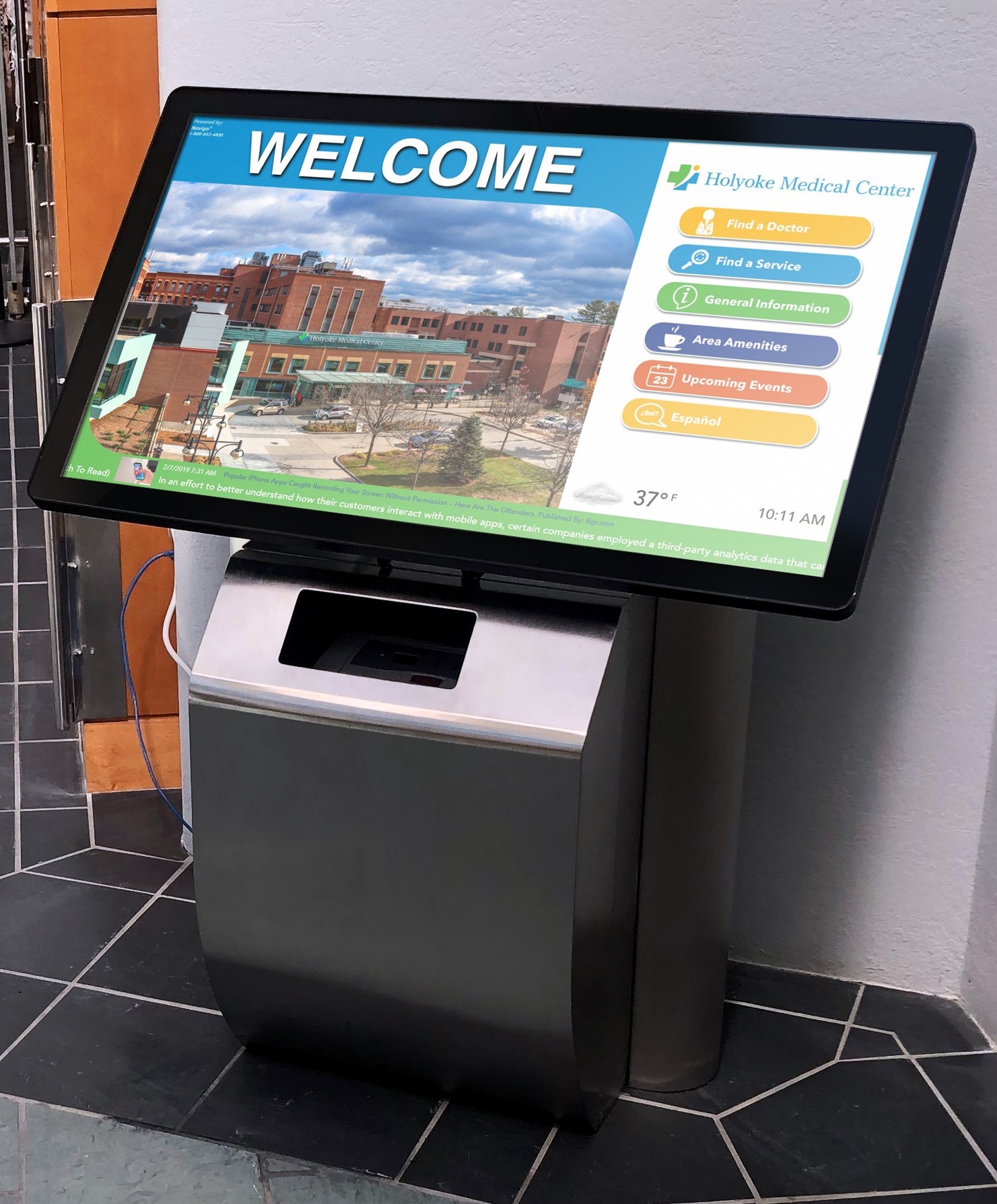 Navigo® provides a comprehensive ecosystem of digital health signage designed to reduce patient anxiety and improve hospital operational efficiency. Our ADA-compliant kiosks and cloud-based communication tools integrate seamlessly with hospital ecosystems to provide real-time updates, vendor tracking, and interactive navigation. From large-scale medical campuses to local clinics, Navigo® helps you provide a "patient-first" environment.